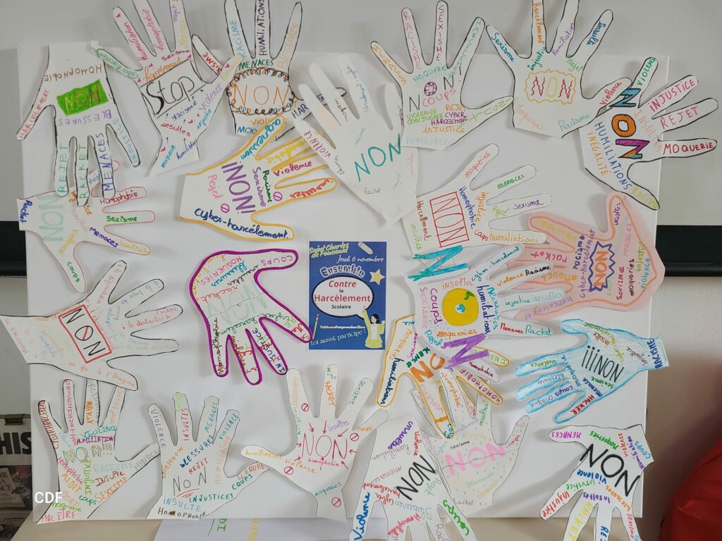 - La journée contre le harcélement scolaire et le cyberharcélement : le collège participe activement à cette journée en proposant des tableaux d’expression libre. Puis les veilleurs, qui sont des élèves volontaires et qui veillent sur leurs camarades plus fragiles.